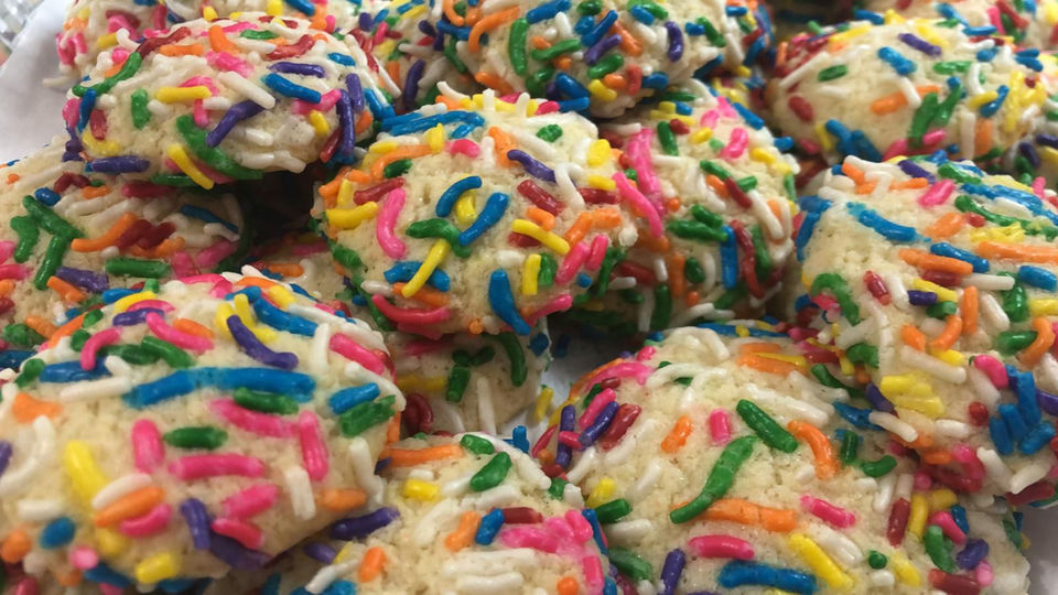 LARGE CONTAINER Sprinkle Cookies at HOME STYLE BREAD AND CAKES. Each cookie, crafted with finest ingredients and rainbow sprinkles, is visually appealing and delicious. Ideal for celebrations or everyday treats, these cookies showcase our commitment to quality and home-baked goodness. Enjoy the perfect mix of crispiness and melt-in-your-mouth texture. Indulge in the comforting, nostalgic taste only our bakery can offer.